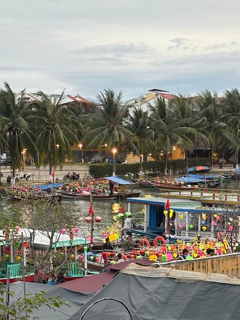 This is the area where we took our evening walk to have a look around. Being the Lunar New Year holiday the whole city was beautifully decorated with flowers, plants and lamps in the colours of red and yellow. Small narrow alleys surrounded by small shops, cafés and restaurants. We had dinner on a roof terrace overlooking the river with all its boats lit up by lamps.