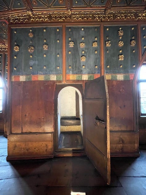 I went through this door to what once was the bedchamber. Although renovated through the years it still gives you a hint of the luxury of the past. A feature which must have been the hight of luxury at the time is the toilette hidden behind a door at the outer wall. I was so eager to see it, thought it was behind a door which was slightly open at the corner of the room. I could not see anything so stepped over the wooden, raised floor to walk up to the door where a sign said forbidden to go. I was not intending to go through the door, but when I stepped on the wooden panel the alarm was set off. Quite embarrassing I quickly stepped back on the floor. The guard courteously guided me to the door where the toilette was. It is what we in Sweden call an outdoor toilette, basically a hole in the floor with a wooden frame. Used already by the Romans.