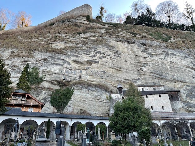 The Dom Quartier museum is an interesting museum with a variety of exhibitions; galleries, the Dome, curiosity cabinet etc. Unfortunately, the state rooms were closed when we were there. A short visit to the catacombs at St. Peter’s Cemetery, built into the cliff that the fortress is built on. It is the oldest cemetery in Salzburg. It dates back to around 700 when the Abbey was established. Lots of stairs and small alleys to climb to see the two chapels built into the cliff.