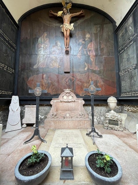 At the entrance is the place for some of the more famous people buried here. Here lie Anna Maria (Nannerl) Mozart, the elder sister of Amadeus, and Michael Haydn, the younger brother of Joseph.