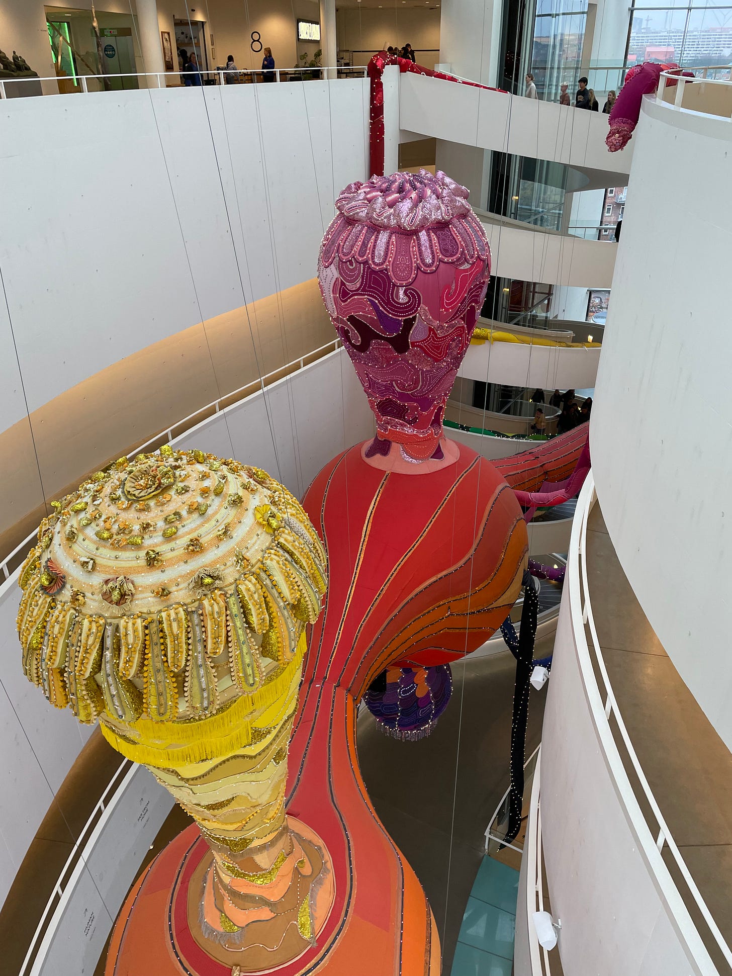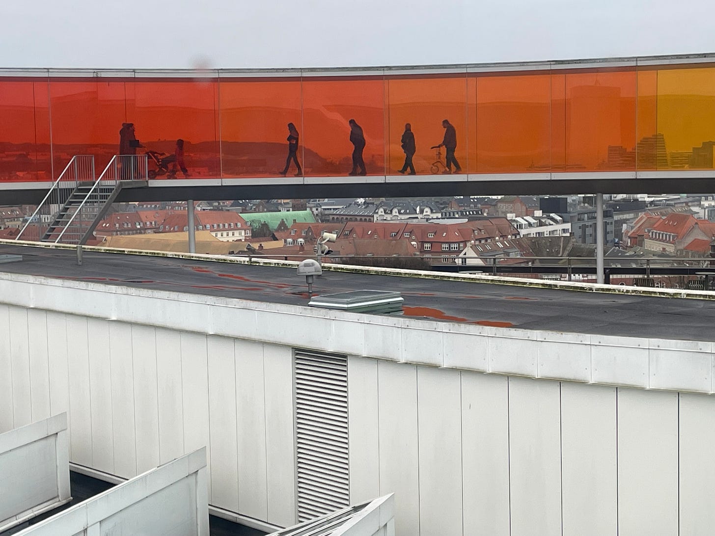 We continued down town, which turned out to be up (it is rather hilly here) for a visit to ARos, the modern art museum. The building is an architectural feat with a round circle on top of the house, where you can walk around and enjoy a 360 degree view of the city. In the middle of the building is a big opening and around them the various exhibitions hall are placed. There are eight floors. Going, up or down, you can use a stairway circling around the opening, from top floor to bottom. In the middle, hanging in the air, was an amazing textil statue of Ran hanging.