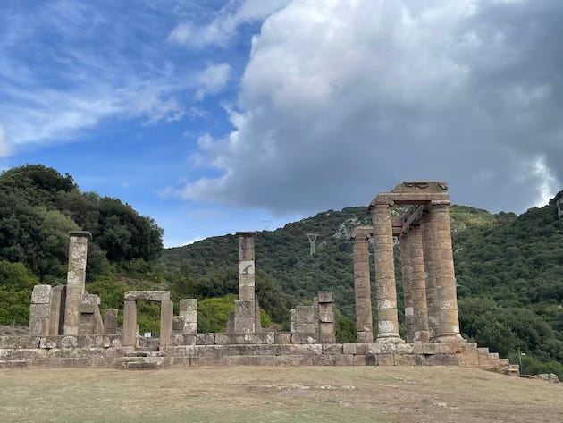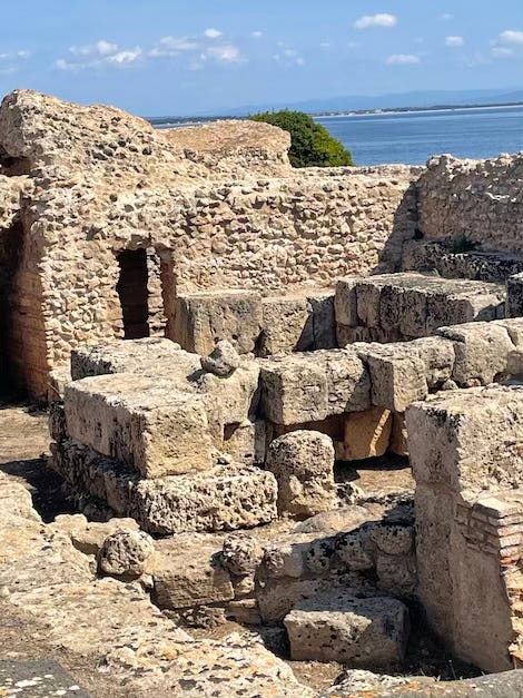 The place was inhabited from 8th century BC and abandoned in the 10th century. First by the Phoenicians, then by Punics (Carthaginians) and then by the Romans. It was the capital of a Roman/Byzantine state from the 9th century until 1070 until it came under pressure of Saracen raiders. Shortly afterwards it was abandoned. The city tells the story of two thousand years of history. It is with great respect that we walked around the rather large city, now in ruins. Beautifully, situated by the sea, with several Roman baths, so people must have enjoyed being refreshed in the heat of the summer. It was the same in Nora, it also has several baths around the city.